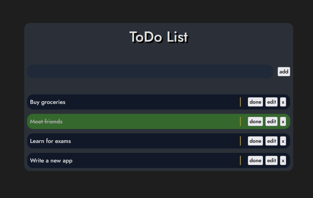 Eine einfache ToDo-Liste, die Elemente lokal speichert, sodass sie beim nächsten Aufruf nicht verloren gehen. Man kann ToDo's erstellen, editieren, löschen und den Status auf "Erledigt" setzen.