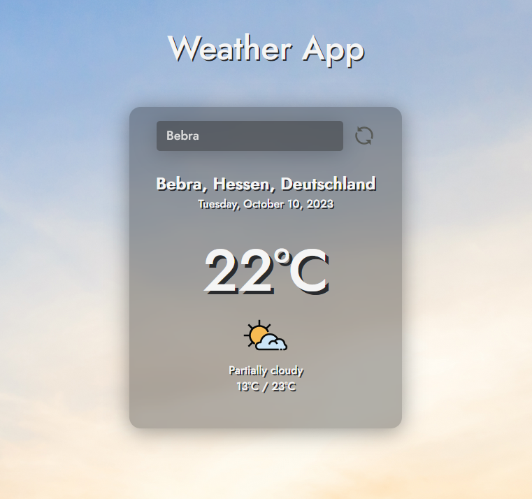 Wetter-App, die das aktuelle Wetter anzeigt - darunter die aktuelle, höchste und niedrigste Temperatur, der Ort (+ Land) und das aktuelle Datum. Die Daten werden von einer API bezogen. Sobald man etwas in die Suche eingibt, aktualisiert sich der Ort automatisch basierend auf der Eingabe (sofern der Ort existiert).